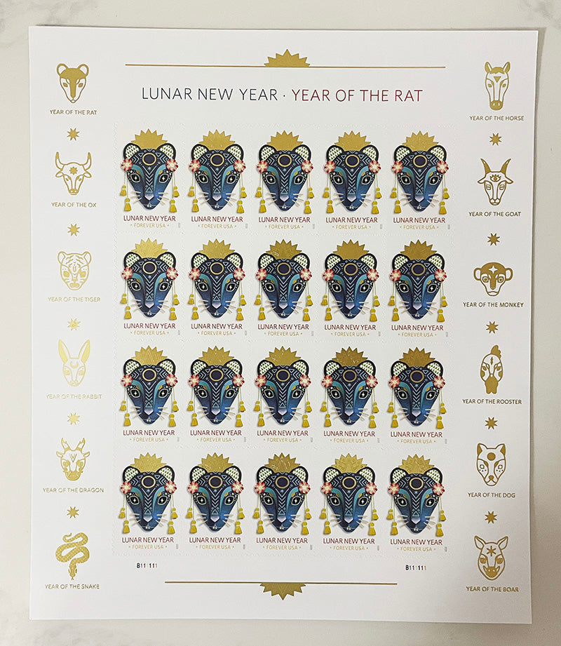 With blue as the predominant color — said to be one of the lucky colors for individuals born during the Year of the Rat — the rat mask in the stamp design incorporates elements with symbolic meaning. Several of the patterns were created with the style of Asian textiles and the circle in the center of the rat’s head represents the new moon on which the Lunar New Year begins. A pop of the very lucky color red ties the design in with other common celebratory decorations.